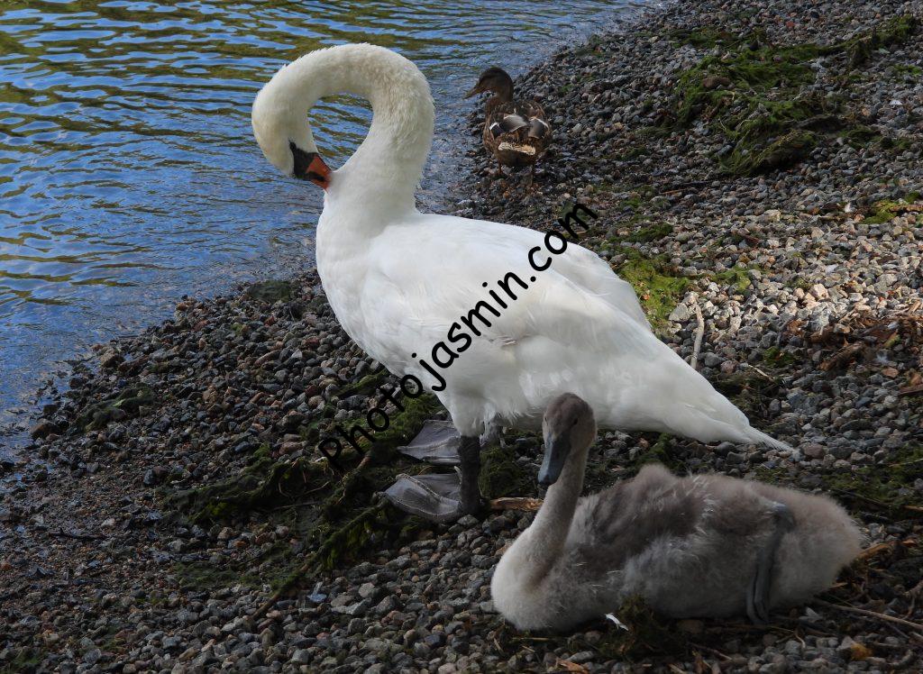 7. A swan with a cygnet and a young duck in the background, photographed on a beach near Nyckelvicken, August 2025.