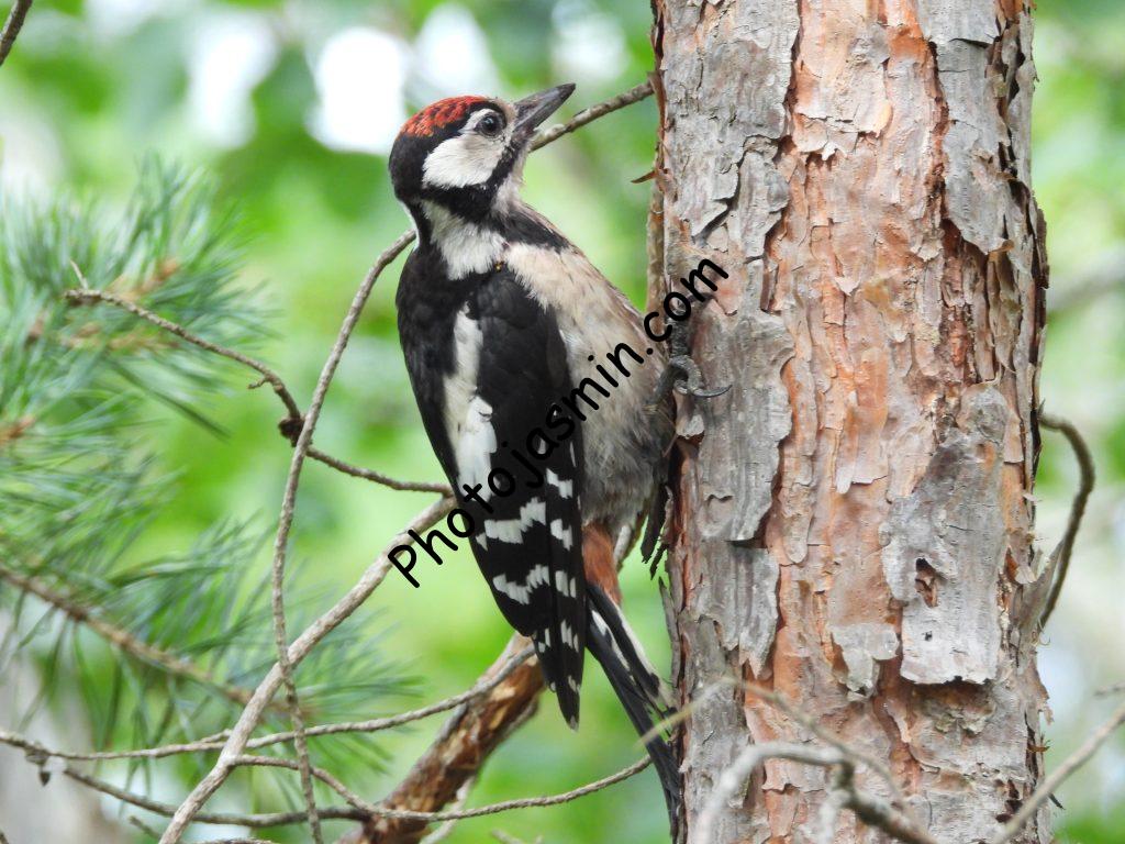 8. A young woodpecker perched on a pine tree in the forest after a summer morning rain.