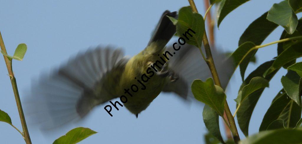 12. The Eurasian blue tit takes off from the apple tree, showcasing its beautiful wingspan.